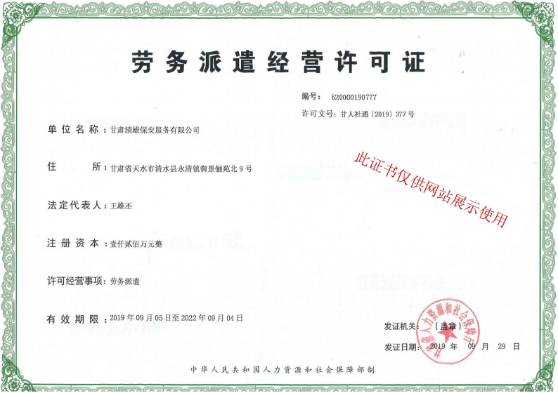 甘肃清雄保安服务有限公司是甘肃省公安厅审批、甘肃省工商局注册、天水市公安局和清水县公安局共同监管的集人防、技防、物防为一体的大型安保服务公司。获得甘肃省公安厅批准并颁发的“保安服务许可证”、“保安培训许可证”;甘肃省人力资源和社会保障厅批准并颁发的“劳务派遣经营许可证”;甘肃省中小企业发展协调服务中心颁发的“甘肃省AAA级信誉单位”、“甘肃省重质量守信誉先进单位”荣誉证书。甘肃清雄保安服务有限公司总投资1200万元,于2015年11月5日正式成立,位于甘肃省清水县兴盛家居建材城8-12号;因公司业务拓展需要,2020年6月24日在兰州正式成立分公司,位于甘肃省兰州市安宁区桃林村18-8号。公司现有员工400余人,其中专业管理人员30人,保安员300余人,保洁员70人。现有办公场所两层540平方米,其中办公室6间,会议室1间,培训室1间,员工活动室1间。为了加强保安队伍建设,提出“以服务求发展,以质量求生存”的经营宗旨;以“行动军事化,管理... …